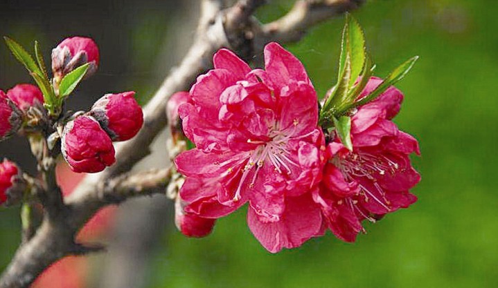 桃花,屬薔薇科,落葉小喬木,高可達6一8米。樹干灰褐色,粗糙有孔。小枝紅褐色或褐綠色,平滑。葉橢圓狀披針形,邊緣有細鋸齒?;▎紊邪?、粉紅、紅等色,重瓣或半重瓣,花期3月。核果近球形,表面密被短絨毛,因品種不同,果熟6一9月。